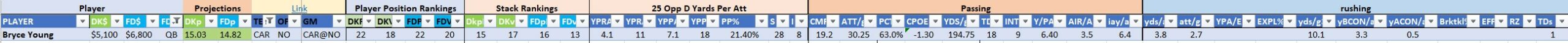 Utilizing two groups also allows us to place running backs into the “run-back” position in certain teams while not including them in the primary stack for their team. This is useful when a situation has an extremely highly projected running back that does not necessarily fit into his team’s passing game. These players are threaded throughout the following construction recommendations.