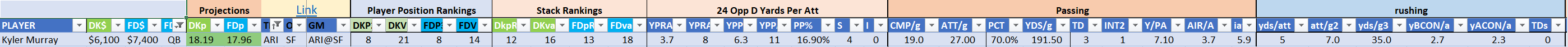 Kyler Murray slots in as a playable quarterback option on both sites this week, with his points rating outpacing his value at market prices around the industry. Murray has had two OK performances to start the season, ranking him in the middle-third of quarterbacks for fantasy scoring. Murray has thrown three touchdowns against a single interception in the two games, averaging 27.0 pass attempts and 7.1 yards per attempt and adding production with his legs. The versatile quarterback has not run a score in for six yet this season but he ranks in the top ten in positional rushing with 5.0 yards per attempt over 7.0 carries per game. Murray gets a mid-board 49ers defense that will be covering for the more limited version of their offense throughout, he has the opportunity to find success with a reasonable complement of weapons at his disposal. Murray is QB8 by points on both sites but dips to QB21 by value on DraftKings and QB13 by value on FanDuel