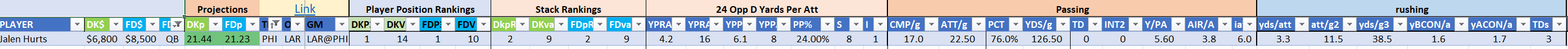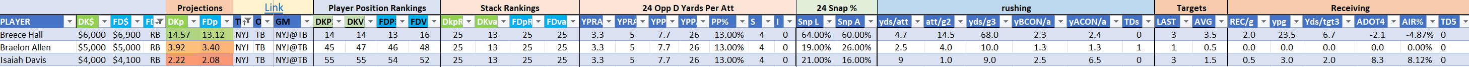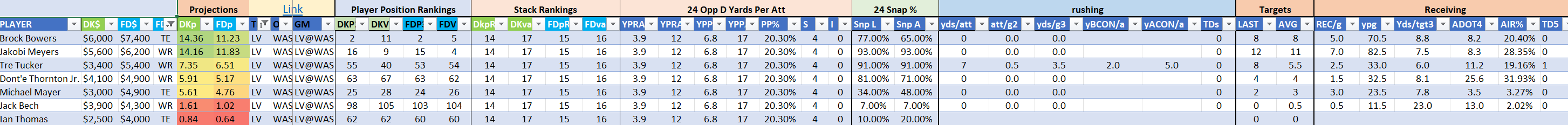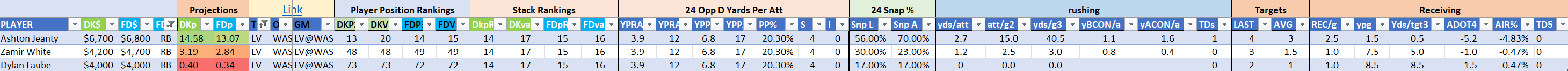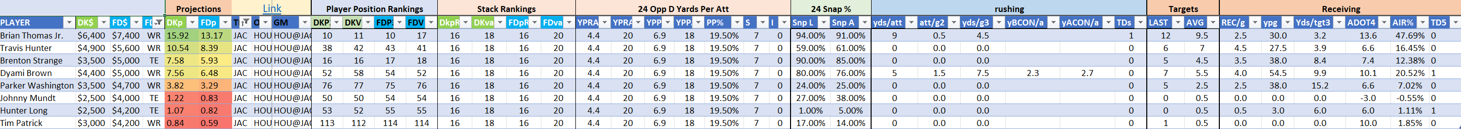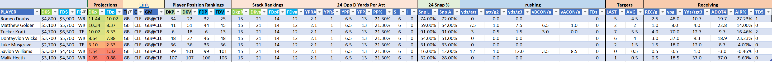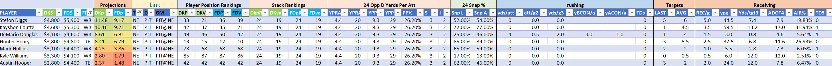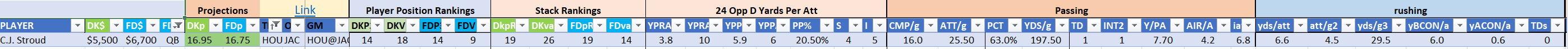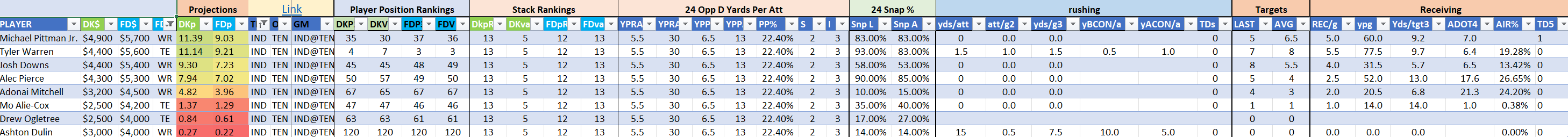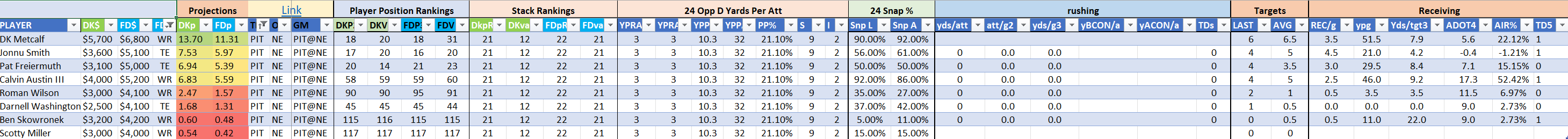 The Steelers are Stack 22 by points on both site but they make major value moves on DraftKings as Stack 11 by points-per-dollar potential. They are Stack 21 by value on the FanDuel slate where they are far less affordably priced. Jaylen Warren is of particular appeal and can be utilized in a standalone role as a value-based running back on either site.