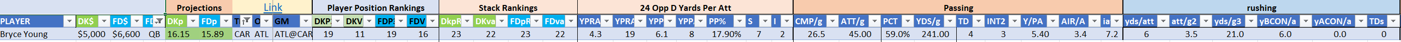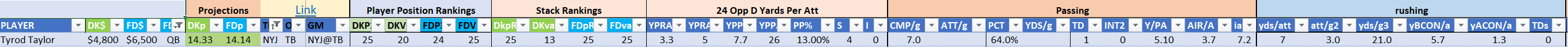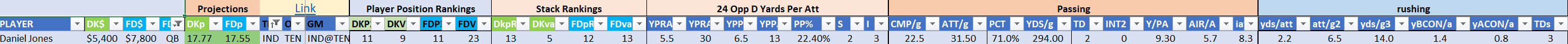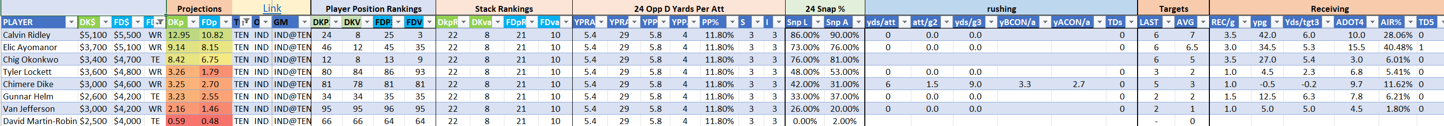 The Titans are Stack 20 by points but leap to Stack 5 by value on DraftKings, they are similarly ranked as Stack 18 by points but Stack 4 by value on the FanDuel slate, with an unfair amount of weight on the rookie passer. This is a spot that may still be best deployed for cheap skill player one-offs around Pollard, Ridley, and Ayomanor.