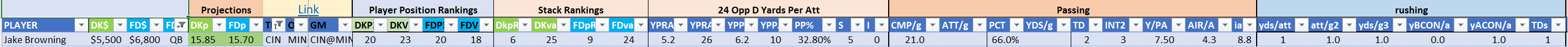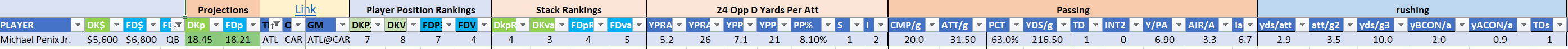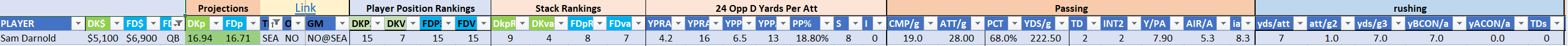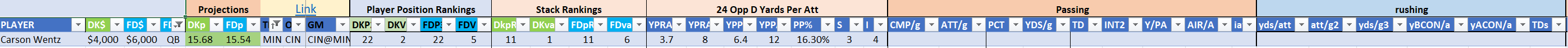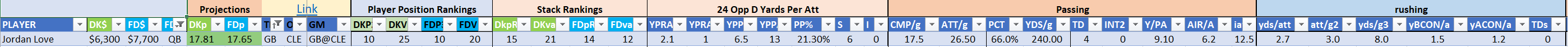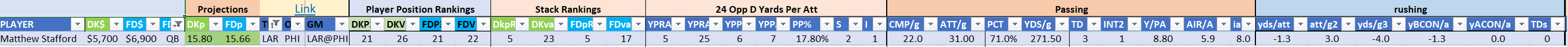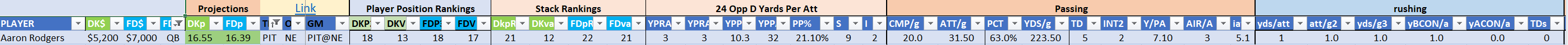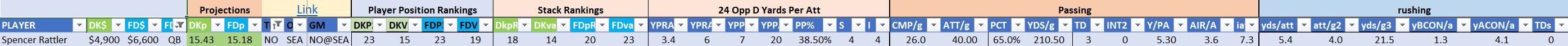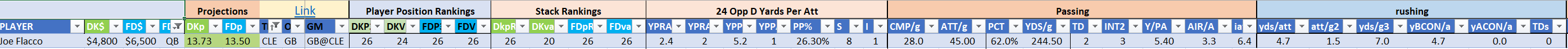 - optional – QB with at least one RB/WR/TE from the Opposing Team (we typically prefer the pass-catchers but high-volume running backs can be effective here)