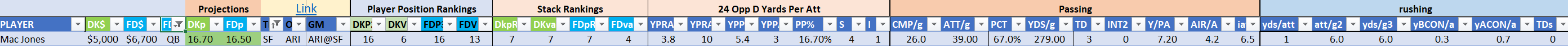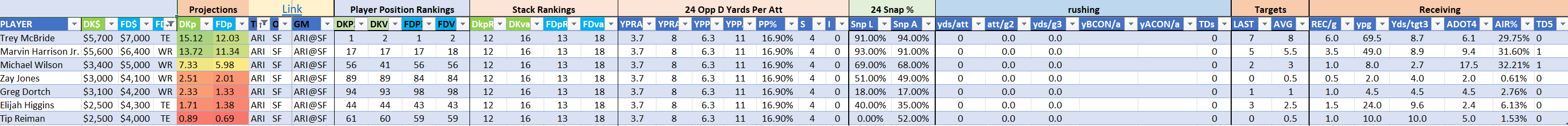 The Cardinals are a playable Stack 11 by points but Stack 17 by value on DraftKings, on the blue site they rank as Stack 13/18 with several of the skill players potentially landing better as standalone values, most notably Trey McBride as the top scoring threat at his position