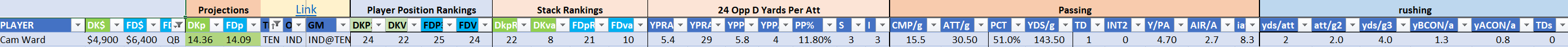 Cam Ward was slightly better in Week 2 than his low-end Week 1 performance but he has yet to reach “good” or even “OK” status after being selected first overall in this year’s draft. Ward is learning on the fly in the developing Titans offense, he threw 28 passes in Week 1, completing only 12 of them for 112 yards and no scoring but, importantly, no turnover. The rookie threw for 175 yards and his first touchdown on 19-33 passing in Week 2 and seems to be developing an important connection with fellow rookie Elic Ayomanor who caught the touchdown pass. Ward ran the ball four times but gained just 2.0 yards per rush attempt in Week 2, he did not run the ball at all in Week 1. The quarterback is very cheap at $4,900/$6,400 across sites but he is low rated and should not make much of an impact as QB24/22 and QB25/4 across sites.