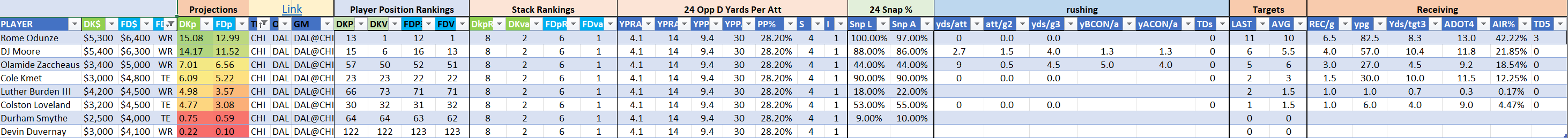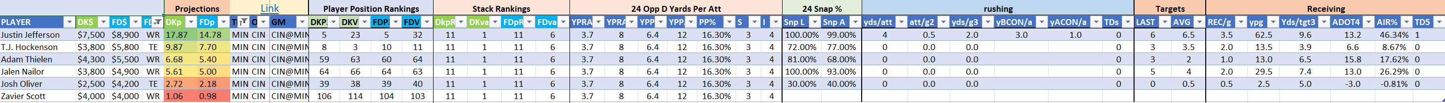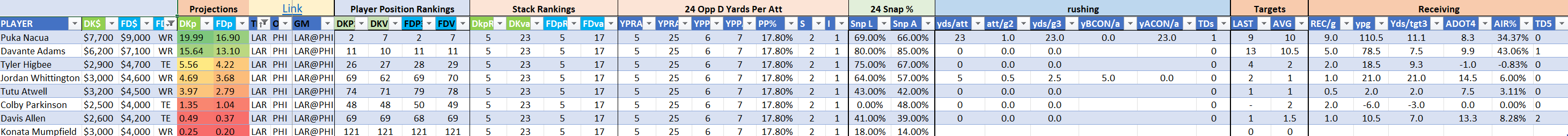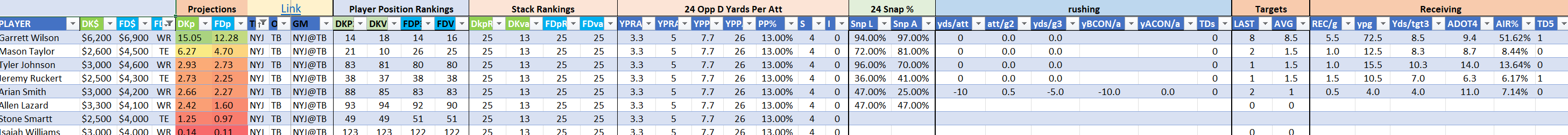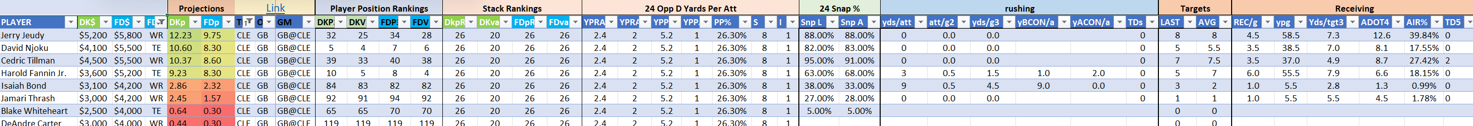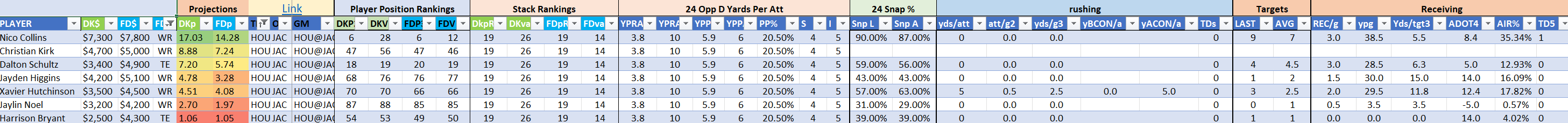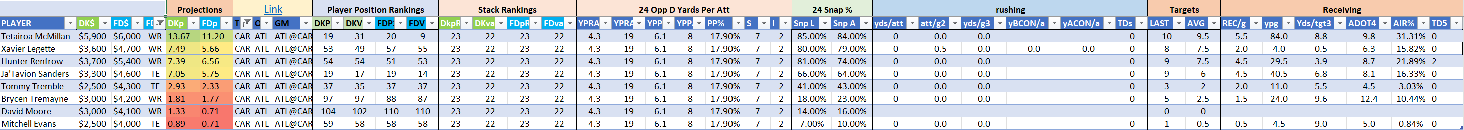 We will maintain the list of rules and limits throughout the season, with occasional tweaks. Each week sees another fresh crop of value plays as situations change and injuries create opportunities around the league. These changing roles and emergent value plays are accounted for in creating these groups from week to week. After a large pool of lineups is created utilizing these groups, it is still critical to filter them for factors including ceiling projections and leverage potential. These groups should help ensure that a highly correlated premium set of options that rotates through various combinations is utilized to create the full lineup pool.