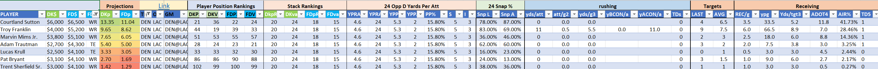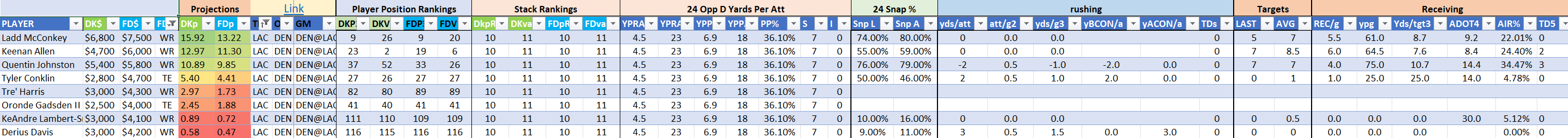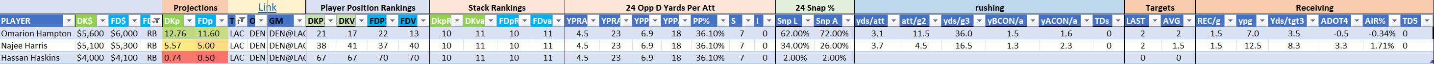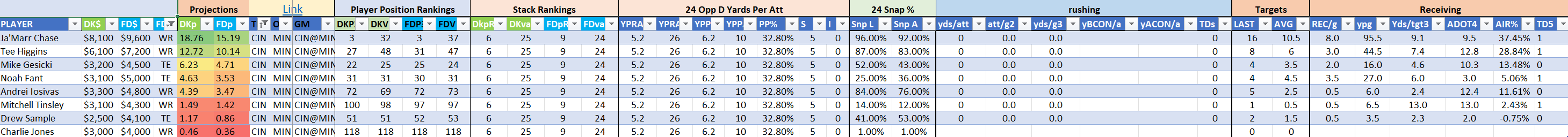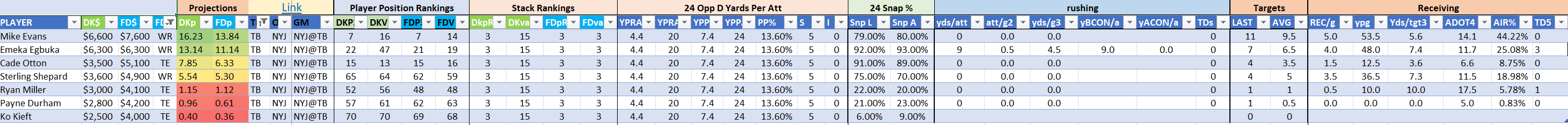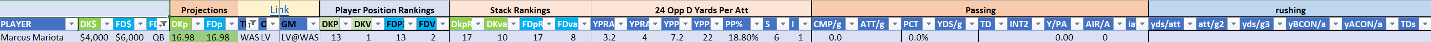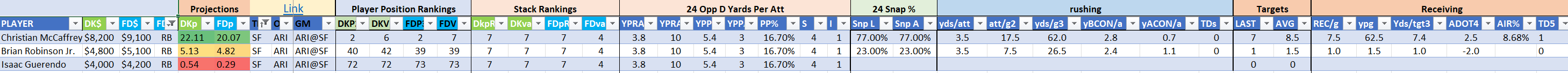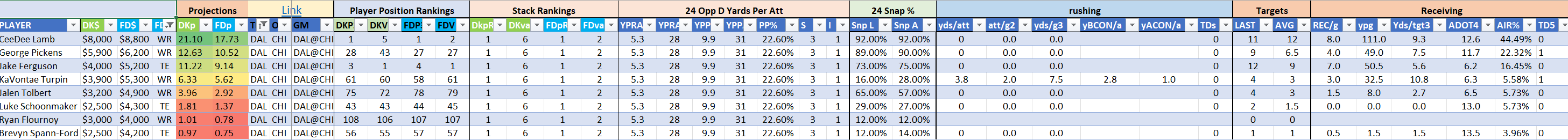 We will maintain the list of rules and limits throughout the season, with occasional tweaks. Each week sees another fresh crop of value plays as situations change and injuries create opportunities around the league. These changing roles and emergent value plays are accounted for in creating these groups from week to week. After a large pool of lineups is created utilizing these groups, it is still critical to filter them for factors including ceiling projections and leverage potential. These groups should help ensure that a highly correlated premium set of options that rotates through various combinations is utilized to create the full lineup pool.