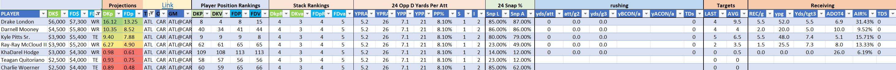 Drake London leads the way in the passing attack with 9.5 targets per game, though his massive 15 targets in the first game took a big dip along with the rest of the team’s passing attack last weekend. London pulled in just three of four targets for 49 yards and failed to score again in Week 2. Despite the heavy volume in the first game, the receiver managed just 55 yards on eight catches for a weak 3.7 yards per target. London is capable of far more, he went over 1,000 yards for the first time last season, posting 8.0 yards per target with 100 catches for 1,271 yards and nine touchdowns. As WR8 by points and WR4 by value on DraftKings and WR8/16 on the FanDuel slate in a stack that is primed for success, London looks like a high-priority receiver both in and out of stacks in Week 3.