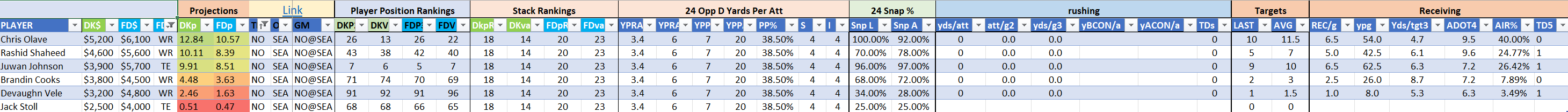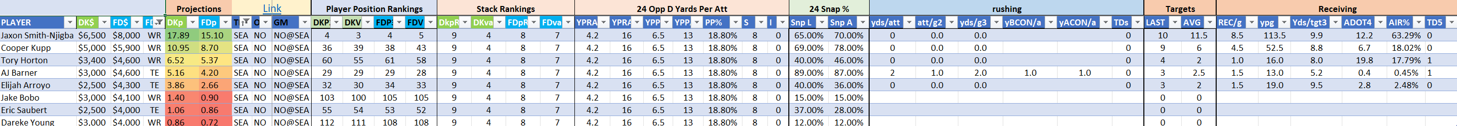 The Seahawks are Stack 9 by points and Stack 4 by value on DraftKings where several options check in somewhat inexpensively. The Stack 9/10 rating on FanDuel is a bit lighter while remaining highly playable. There is a strong chance that Kenneth Walker III will be popular but worthwhile in and out of Seattle stacks this week, he has been very good early in the season and should spike additional opportunities. This is a team that has enough skill to carry them to slate-winning DFS days throughout the season, while they are not the top priority of the slate they should not be ignored.