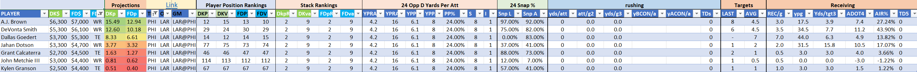AJ Brown is coming off of back-to-back weak performances but he has a chance to excel against the Rams if Hurts is actively throwing the ball this week. Brown caught just one pass for eight yards on a single target in the Week 1 game, despite running 31 routes over 54 snaps. He ran 23 routes on 56 snaps in Week 2 and pushed his target volume up to eight opportunities, bringing in five of those but gaining only 27 yards in the process. Brown is quite a bit better than his 1.17 yards per route run in that contest, he has major scoring potential and came away with seven touchdowns in each of the last two seasons, though he does share a bit of that opportunity with 1A receiver DeVonta Smith. Hurts is WR12 by points on both sites, he is WR15 by value on DraftKings and WR11 by value on FanDuel with a bit of hope that he slips to lower-than-he-should ownership levels off of the two light performances.