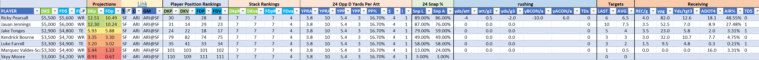Kendrick Bourne is WR79/82 and WR74/75 and is nothing more than a depth option behind several demanding volume spots. Bourne was targeted three times on 24 routes run, and gained 1.33 yprr in the first contest of his season last week, he should meet similar expectations this week.
