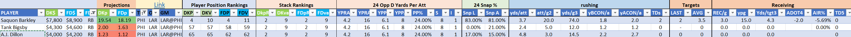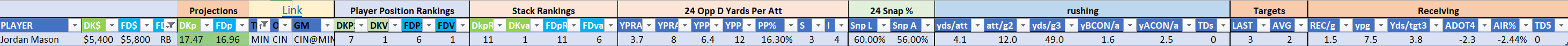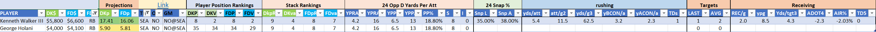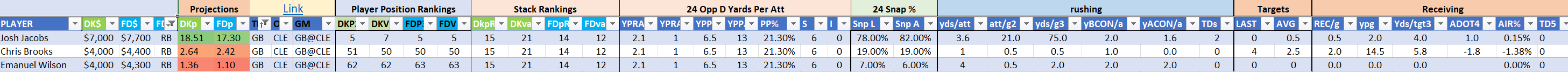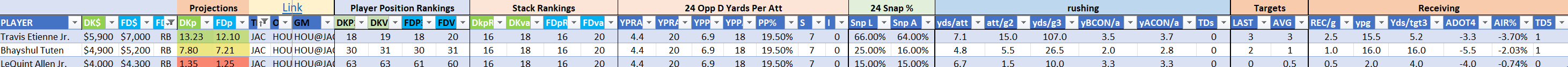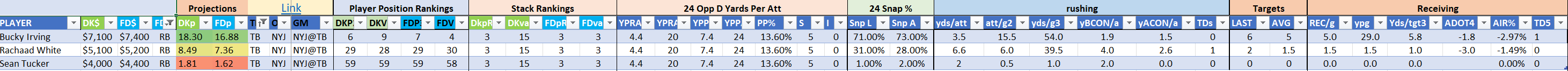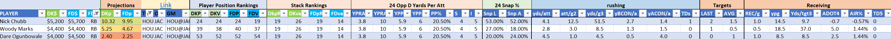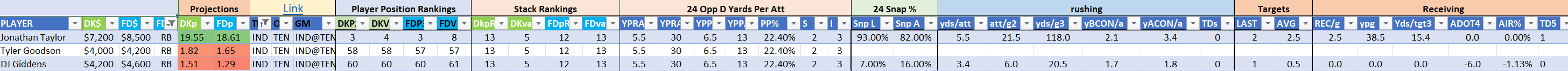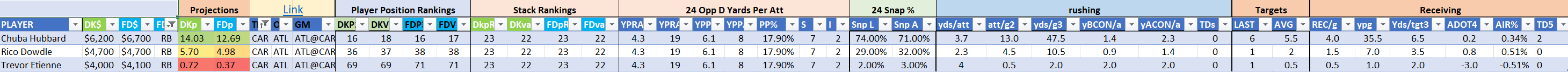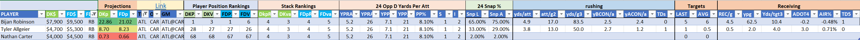 Utilizing two groups also allows us to place running backs into the “run-back” position in certain teams while not including them in the primary stack for their team. This is useful when a situation has an extremely highly projected running back that does not necessarily fit into his team’s passing game. These players are threaded throughout the following construction recommendations.