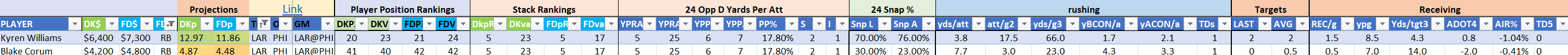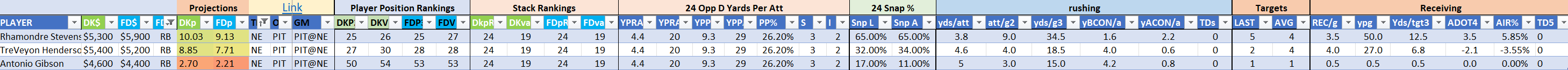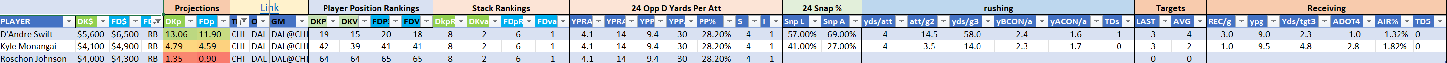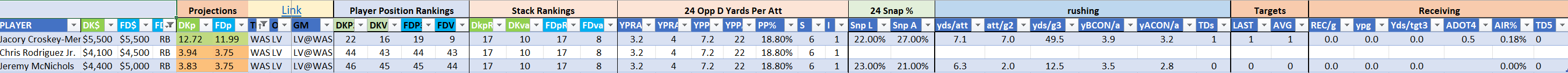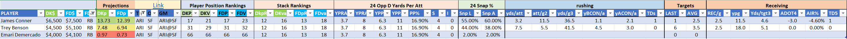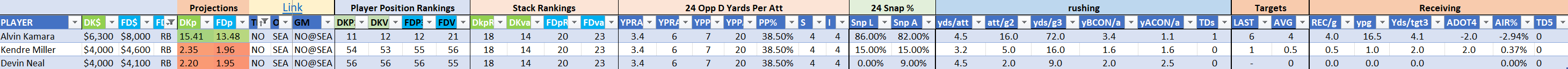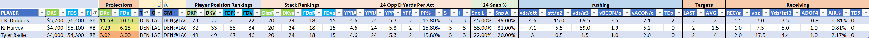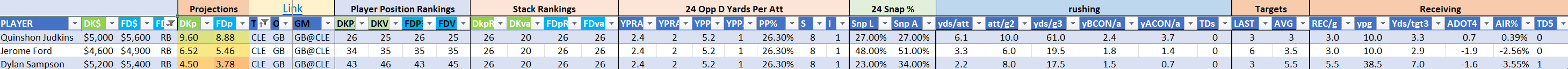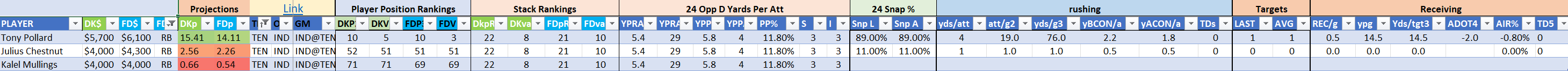Utilizing two groups also allows us to place running backs into the “run-back” position in certain teams while not including them in the primary stack for their team. This is useful when a situation has an extremely highly projected running back that does not necessarily fit into his team’s passing game. These players are threaded throughout the following construction recommendations.