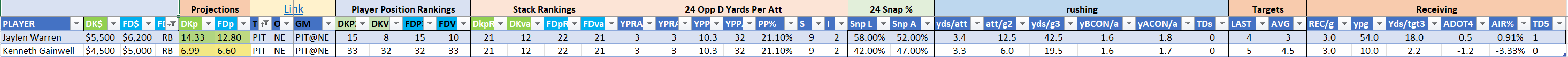 The Steelers ground attack is led by Jaylen Warren who has drawn a 52.0% snap share over two games this season. Warren is seeing 12.5 carries and another three chances per game in the passing attack but he does not have standout volume numbers. The running back has been held to just 3.4 yards per rush attempt but has found a few big gains in the passing game and remains an explosive option with upside for a fair price. Warren looks particularly strong as a value play on DraftKings, where he lands as RB15 by points but RB7 by value, he is RB15/10 on the FanDuel board and functions well outside of Steelers stacks. Warren gained 134 yards from scrimmage last week on 18 touches from 18 opportunities, he ran 17 routes over 34 snaps and drew a solid 23.5% target share on those routes. Warren seems to be pulling away from the crowd in the Pittsburgh backfield but there are productive options behind him as-needed.