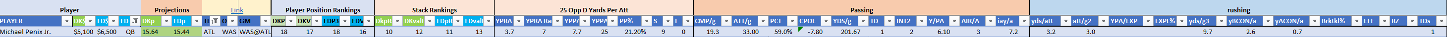 The Falcons are Stack 10 by points and Stack 11 by value on DraftKings, they are Stack 11 across the board on the FanDuel slate. The team is bolstered somewhat by quality skill players, with their quarterback not playing particularly well and grading out for another mixed performance, despite facing a lousy defense, Falcons skill players might be deployed best as one-off options in other lineups or bring-back plays in stacks of Commanders, though they also are just a middling stack this week