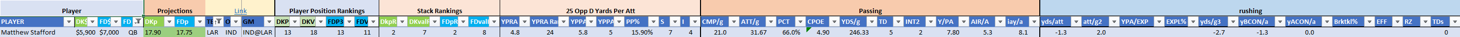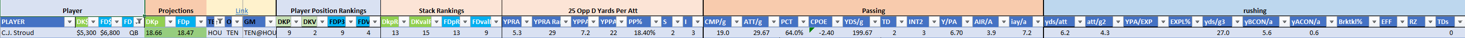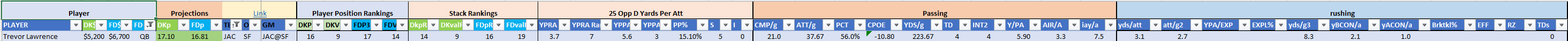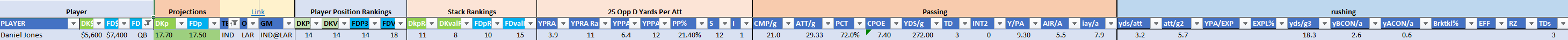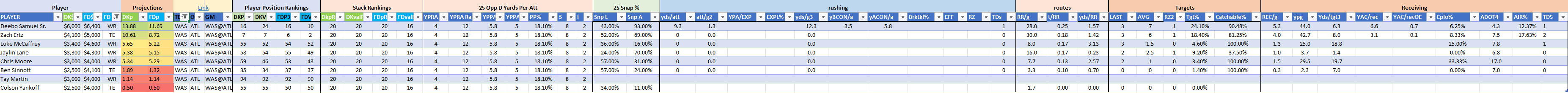 The Commanders are an interesting play for value on one site with half the team missing in action. There are quality pieces who may go overlooked surrounding a still-capable veteran backup who showed quality just last week. Washington is nothing more than a interesting discussion as just Stack 20/19 on DraftKings but they are more in play as Stack 20 by points but Stack 13 by value on the FanDuel slate. Deebo Samuel and Zach Ertz have individual playability in unstacked lineups with lower-end potential from the depth receivers in this offense.