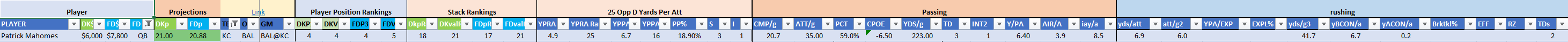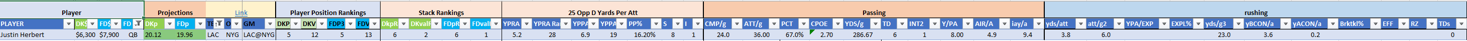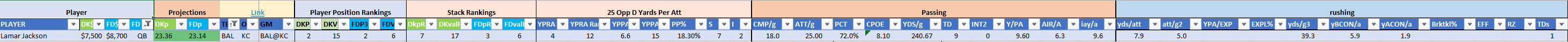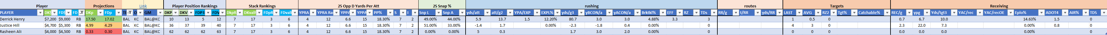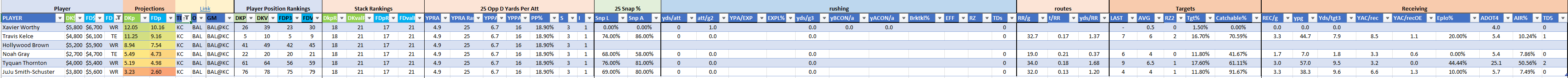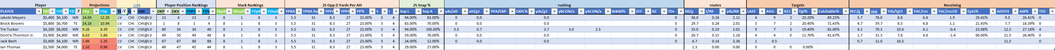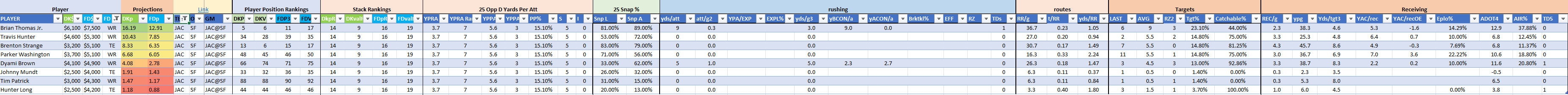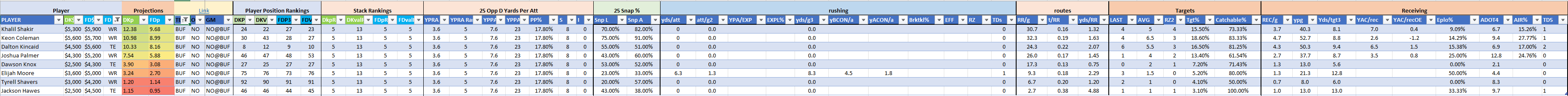 The Ravens are Stack 7 by points on DraftKings but they slip to Stack 17 by points-per-dollar scoring with Jackson taking a dip in the value column at a hefty salary. The team grades out better across the board on the FanDuel slate, where they are Stack 4 by points and Stack 6 by value. Jackson and Henry are high priority options in any lineup configuration, while Zay Jones and Mark Andrews are playable in standalone situations but likely somewhat better in stacks.