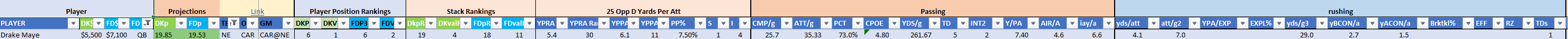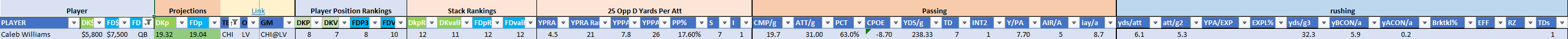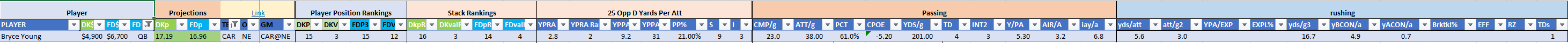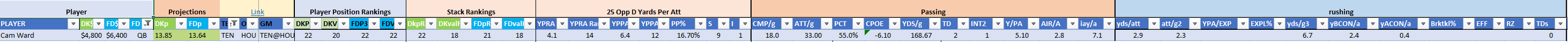 Cam Ward has completed just 55.0% of his pass attempts with a -6.1 CPOE for the season. The rookie quarterback is going through some early growing pains with limited signs of quality, he has two touchdown passes and an interception in three games while throwing for just 5.1 yards per pass attempt on the year. Ward has at least demonstrated a growing connection with rookie receiver Elic Ayomanor in early action, which is something in a near total absence of quality otherwise. The quarterback managed his first game of more than 200 yards with 219 on 23-38 passing for a touchdown and an interception last week but that will not win a DFS slate at any price. Ward has failed to add any quality in the rushing game and has been a very limited passer, there is not much value in QB22/20 and QB22/22 across sites on a 22-quarterback slate.