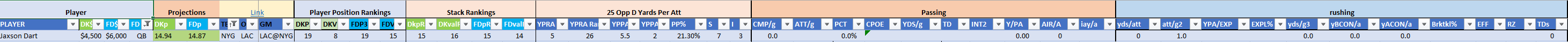 The Giants have only reinforced the notion that they are a team without a plan by naming rookie late first-rounder Jaxson Dart as the team’s starter going into Week 4. The team was originally committed to a path that would allow the work-in-progress Dart to come along slowly, playing behind veterans of reasonable caliber in Russell Wilson and Jameis Winston, with Wilson getting the initial starting nod. Apparently, Dart learned everything he will ever need to know about NFL football in just three weeks because the organization is once again being run by WFAN sports radio callers and thrusting the rookie into action in a limited offense behind a leaky line. Dart rates as QB19 by points but the cheap price does land him as QB7 by value on DraftKings. He is QB19/12 on the FanDuel slate. Dart has appeal for his ability on the ground, if he can manage to find any kind of form in his first NFL start. The rookie will likely be over-matched against a Chargers defense that has generated a 21.3% pressure rate with seven sacks over three games. Dart does have one premium pass catcher and a quality rookie masher at running back on his side but it is unlikely to be enough.