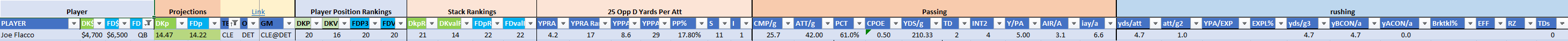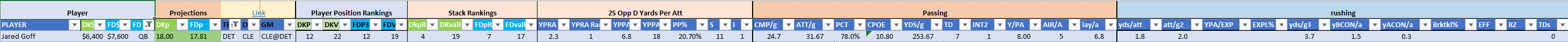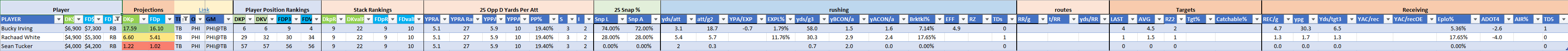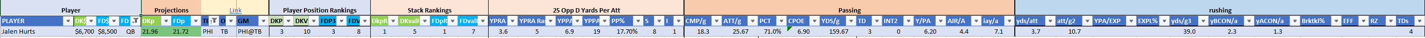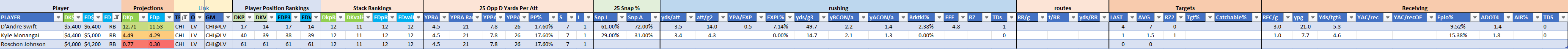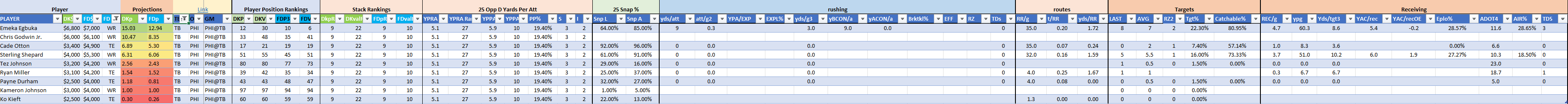 The Eagles simply have too much quality to drop far down the stacks board, in what could be an interesting matchup against Tampa Bay, they rate as Stack 1 by points on both sites while landing as Stack 6 by value on DraftKings and Stack 8 by value on the blue site. Philadelphia is a premium offense in a reasonable spot, they should be pushed by Tampa Bay’s scoring potential in a game they will want to win, the right recipe is in play for this team to deliver a quality performance through at least one of their many scoring mechanisms.