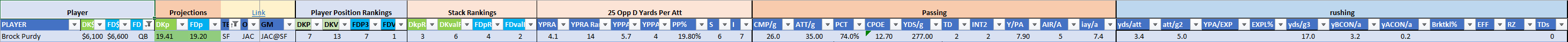 The 49ers rate as Stack 2 by points and Stack 1 by value on DraftKings in Purdy’s return, they are Stack 2 by points and Stack 1 by value on the FanDuel slate, though those numbers dip on both sites in the absence of one or both of the wide receivers. Christian McCaffrey is an excellent option in any situation on either site.