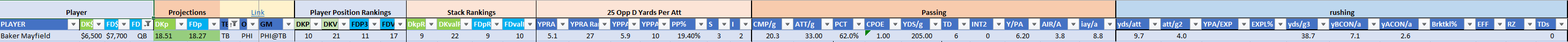 Baker Mayfield joined a growing list of injured Buccaneers during the middle of the practice week but is trending toward playing through a reported biceps issue. Mayfield got in a full practice on Friday and looks good to go barring a setback as of early Saturday morning. The quarterback has been a strong fantasy scoring performer to start the season, he has six touchdown passes on 6.2 yards per pass attempt with zero interceptions with a +1.0 CPOE. Mayfield throws steady volume with 33.0 pass attempts per game but it will be interesting to see what happens to that volume between his status, the absence of Mike Evans, and the return of Chris Godwin. Mayfield could deliver, he has been undeniable at the quarterback spot in recent memory and rates as QB9 by points on DraftKings and QB8 by points on FanDuel, with lower-quality value marks on DraftKings but not on FanDuel where he is an affordable $7.700.