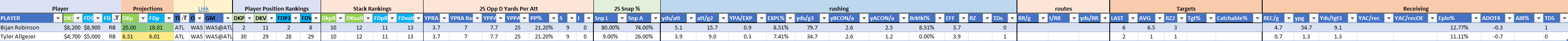 Tyler Allgeier slots in as a touchdown-poaching threat to Robinson and a capable second-string running back who stands to touch the ball 10 times in any given game. Allgeier has a rushing touchdown on the board already this season and gains 3.9 yards per rush attempt over 9.0 carries per game in Weeks 1-3. The running back is not much more than a mixer, he slots in as RB29/29 and RB28/27 across sites, he is a dart throw option at a cheap touchdown on limited action.