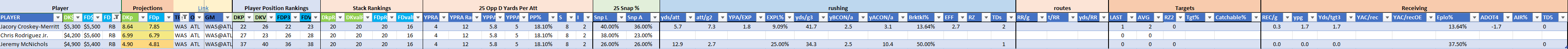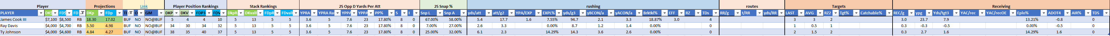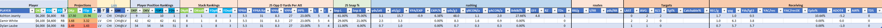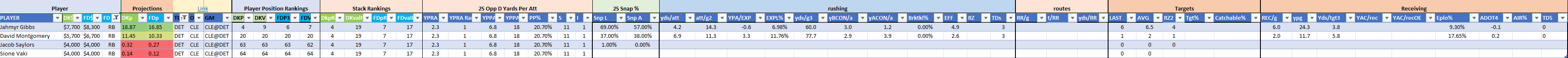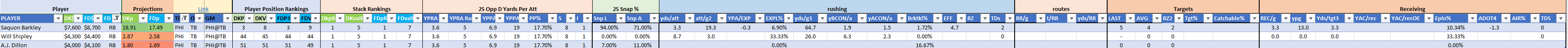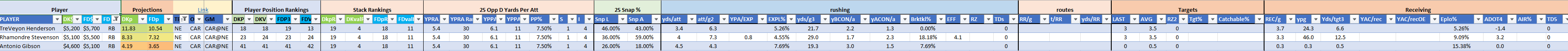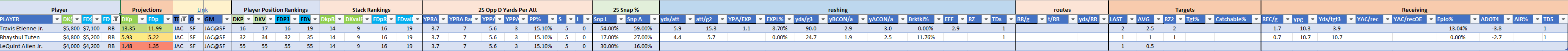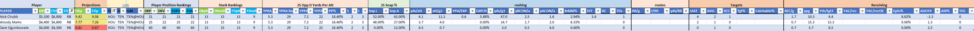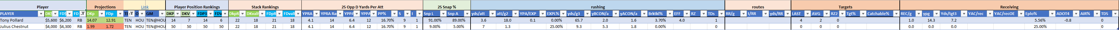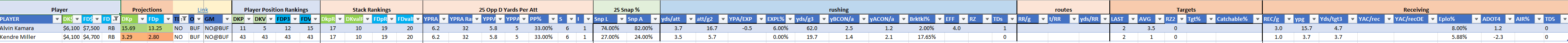 Utilizing two groups also allows us to place running backs into the “run-back” position in certain teams while not including them in the primary stack for their team. This is useful when a situation has an extremely highly projected running back that does not necessarily fit into his team’s passing game. These players are threaded throughout the following construction recommendations.