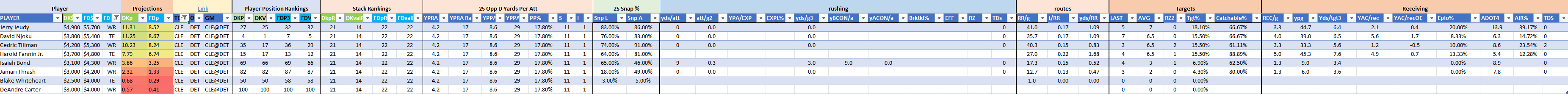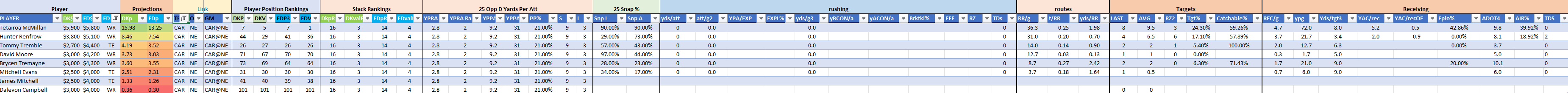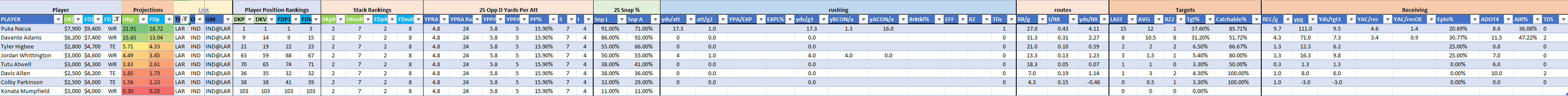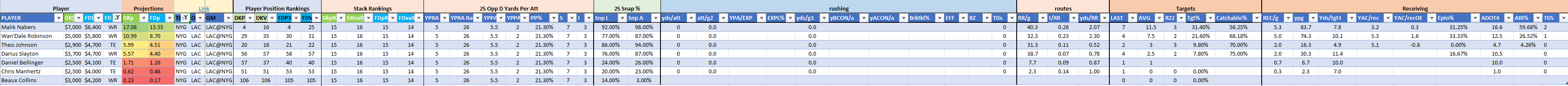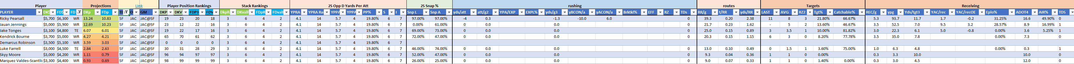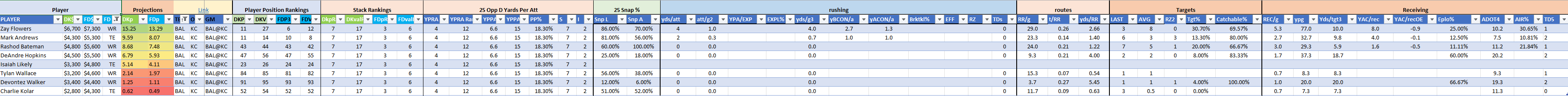 We will maintain the list of rules and limits throughout the season, with occasional tweaks. Each week sees another fresh crop of value plays as situations change and injuries create opportunities around the league. These changing roles and emergent value plays are accounted for in creating these groups from week to week. After a large pool of lineups is created utilizing these groups, it is still critical to filter them for factors including ceiling projections and leverage potential. These groups should help ensure that a highly correlated premium set of options that rotates through various combinations is utilized to create the full lineup pool.