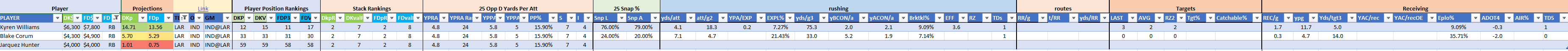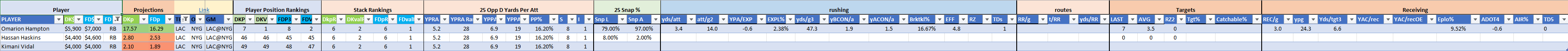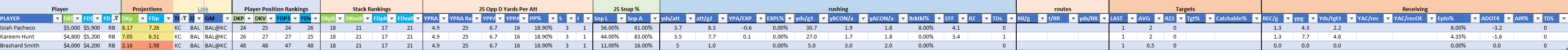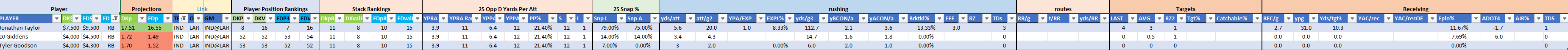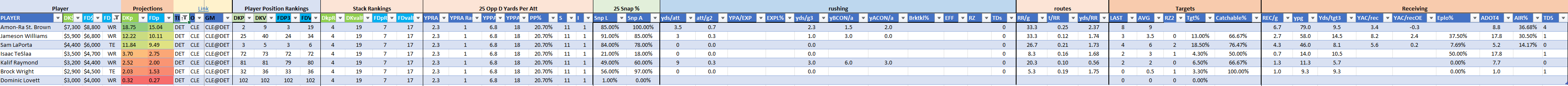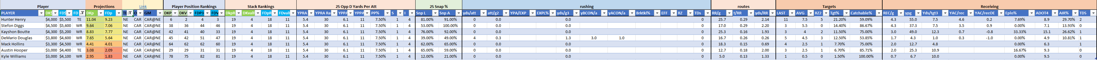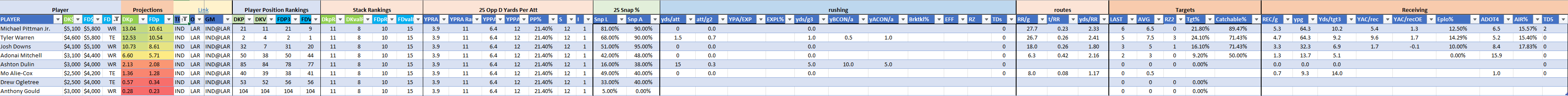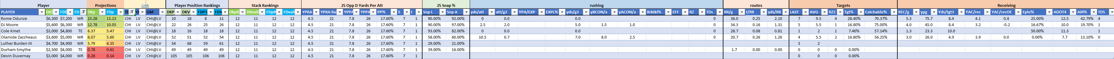 We will maintain the list of rules and limits throughout the season, with occasional tweaks. Each week sees another fresh crop of value plays as situations change and injuries create opportunities around the league. These changing roles and emergent value plays are accounted for in creating these groups from week to week. After a large pool of lineups is created utilizing these groups, it is still critical to filter them for factors including ceiling projections and leverage potential. These groups should help ensure that a highly correlated premium set of options that rotates through various combinations is utilized to create the full lineup pool.