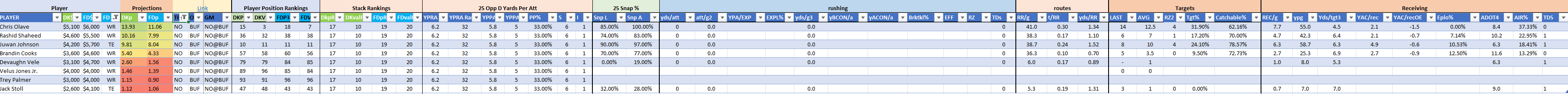 The goal is to create a large pool of well-built lineups that can be utilized in any large-field GPP contest. Our approach is to build far more lineups than needed and utilize a sorting table or sim process to filter to the best set of entries. The lineups created in these crunches should provide a broad distribution that includes some of the lower-owned high-upside skill players from each stack. Applying boosts is critical in pushing and pulling ownership to individual players within their team’s stacked lineups if they appear too much or too little.