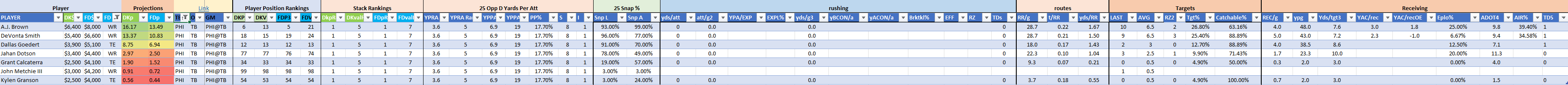 DeVonta Smith is 1A to Brown’s 1 in most situations but he is an excellent option for a slightly lower price and slightly lighter public popularity most weeks. Smith draws 6.5 targets per game for a 25.4% target share that is nearly identical to Brown’s involvement. The receiver sees a healthy 9.4-yard ADOT for 34.58% of the air yards and has found the end zone once, again nearly identical output to his more expensive counterpart. The primary difference has been that Smith has seen a far better catchable target rate from Hurts at 88.9% against the mere 63.2% that has gone toward AJ Brown. Smith is terrific but Brown is the slightly higher-end option overall, they are playable together or separately in or out of stacks. DeVonta Smith rates as WR19 by points and WR14 by value on DraftKings, he is WR20/22 on FanDuel.