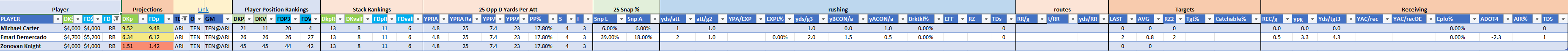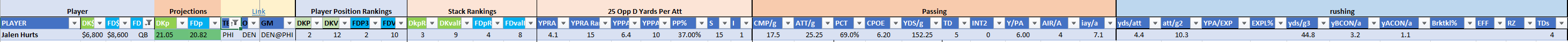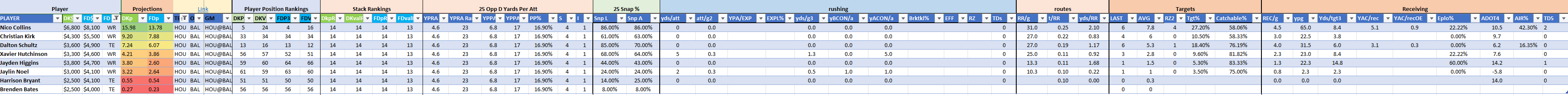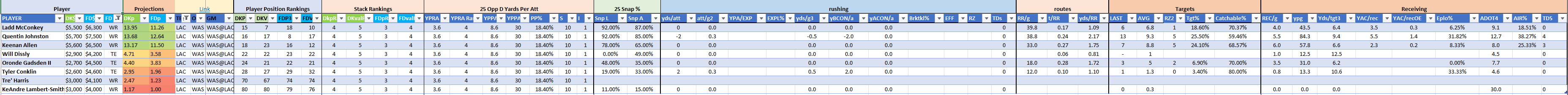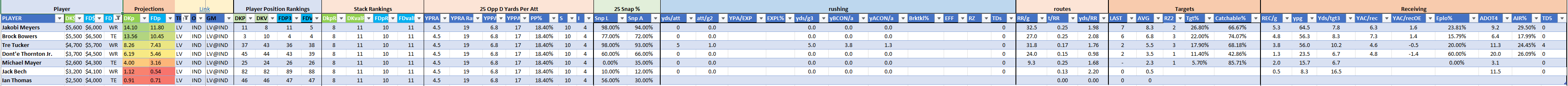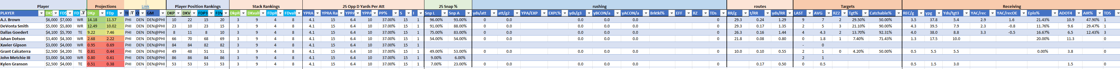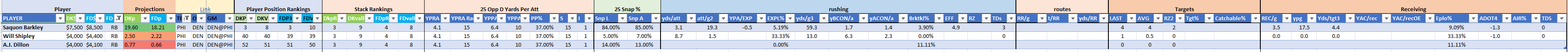 The Eagles are Stack 3 by points and Stack 7 by value on DraftKings and Stack 4/6 on the FanDuel slate against a tough Denver defense, they have plenty of scoring potential and are impossible to fully suppress but there is a lot of danger in play for limited scoring at high pricing. Philly may slip slightly in weekend projection and ranking updates but they are at worst playable on any given slate and their stars remain stars both in and out of stacks.