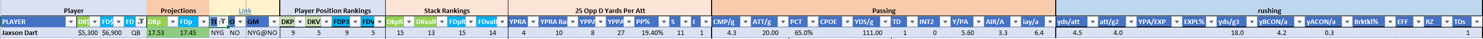 Finally, Jalin Hyatt is a low-end dart at a big play. Hyatt is a field stretcher who tends to come up short of actually catching passes or delivering the big plays his ADOT promises. Hyatt went untargeted over 14 routes last week and has yet to see a chance to catch a pass after running five untargeted routes in Week 3 and missing the first two games of the year. The receiver had a tremendous 18.7-yard ADOT last year and an even more potentially explosive 20.3-yard mark the season before, he caught 23 passes on 40 targets in 2023 and came away with just eight of 19 opportunities in Year 2. Hyatt has zero NFL touchdowns a quarter of the way into his third season after the team spent a third round pick on the speedster, disappointing is not a strong enough word. Hyatt is a weak option who could bend a slate with one huge play but is unlikely to do so.