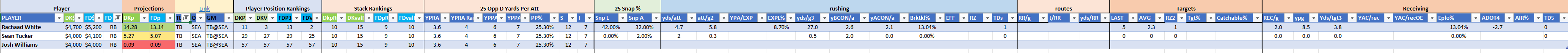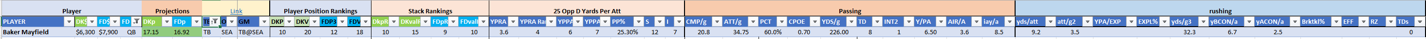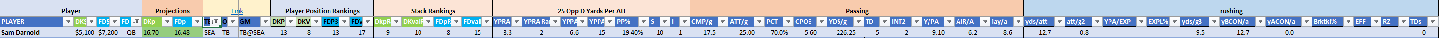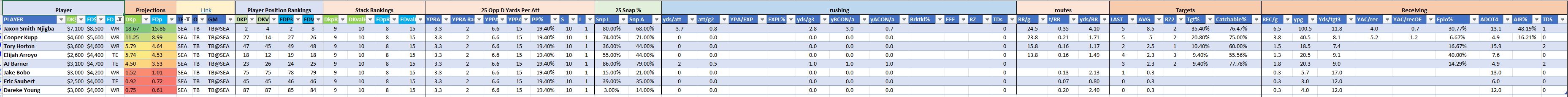 The Seahawks have significant weekly scoring potential that has come mostly from the ground game with a split situation that limits predictability and DFS quality, the true upside should come from the passing game as the season rolls on, but Seattle needs to begin to throw the ball more frequently to truly make that happen. Darnold is a capable quarterback with a star receiver, a veteran safety net, outstanding support in the ground game, he should be able to find success against a mid-board Tampa Bay defense. Seattle is Stack 10 by points and Stack 11 by value on DraftKings, they are Stack 9 by points on FanDuel but Stack 16 by value on the blue site.