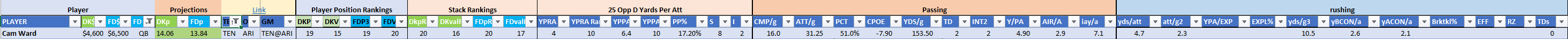 Titans rookie first overall pick Cam Ward checks into the fifth game of his career with a slate-worst CPOE 7.9 points below expectation. Ward has thrown for a fair amount of volume with 31.25 pass attempts per game but his 16 completions per contest fail to inspire, as does his anemic 4.9 yards per pass attempt. Ward has managed a pair of touchdown passes and a matching interception total in four games and has gained very little in the rushing attack. The quarterback has capable pass-catchers in play, he established an early connection with fellow rookie Elic Ayomanor but has been more of a limiting factor for veteran Calvin Ridley. Ward ranks as QB19 by points and QB15 by value on DraftKings, he is QB19/20 on the FanDuel slate and shows very little value at the helm of the week’s lowest-ranked stack for point potential.