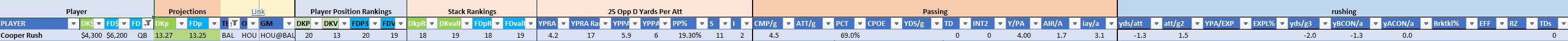 There is a gaping slate-changing absence at the quarterback spot for Baltimore in Week 5 with Lamar Jackson officially out of action. Jackson will hand the reins to Cooper Rush, a far less inspiring option for fantasy scoring but a quarterback who no less will be heading up a strong offense with plenty of skill player upside. Rush played 16 snaps in Week 4 at Kansas City, completing nine of his 13 pass attempts but gaining just 4.0 yards per attempt and 52 overall. The 30-year-old career backup played in 12 games for Dallas last season, a career high. Rush threw 308 passes, completing 187 of them for 12 touchdowns but only 6.0 yards per pass attempt, while losing five interceptions and rating poorly in all accuracy metrics. The quarterback is moderately capable, he will not necessarily destroy the chances of production from his team but Baltimore does not rate as an appealing stack at just a 20.0-point implied total against a defense that is strong against the pass. Houston has allowed just 5.9 yards per pass attempt to rank 6th in the league and they have come away with 11 sacks on the season. Cooper Rush is QB20 by points but QB13 by value on DraftKings, he is QB20/19 on the FanDuel slate.