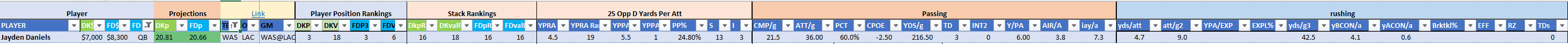 Outstanding Washington quarterback Jayden Daniels is due back after a two week absence with a sprained knee suffered in the Week 2 contest. Daniels played 68 snaps in that game, posting 200 yards on 24-42 passing with a pair of touchdown passes following a 233-yard performance with one touchdown pass in the opener, he is yet to throw an interception this season. The quarterback added 68 yards on 11 rushing attempts in Week 1 but was held to just 17 yards on seven carries before exiting the second contest. With a knee issue that is going to require him to wear a brace in the return to action it will be interesting to see the impact on Daniels’ rushing volume and overall fantasy scoring potential. Given free reign he has one of the leading overall projections on this slate but he is in a tough passing matchup against a Chargers defense that has limited opponents to a league-low 5.5 yards per pass attempt while generating a strong 24.8% pressure rate. Daniels threw for 3,568 yards on 480 pass attempts with 25 touchdowns against just nine interceptions, adding six rushing touchdowns and a fantastic 891 yards on 148 rushing attempts in a standout rookie season, but those totals make it easy to spot where the dip will come from if his volume is limited. While the player is outstanding and likely to be relatively low-owned, this is a truly challenging situation. Daniels rates as QB2 by points but QB18 by value on DraftKings, he is QB2/7 on the FanDuel slate but he could dip by a spot or two before 1pm Sunday in a close race.