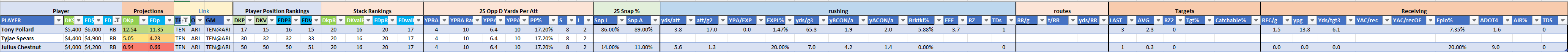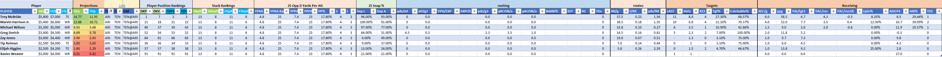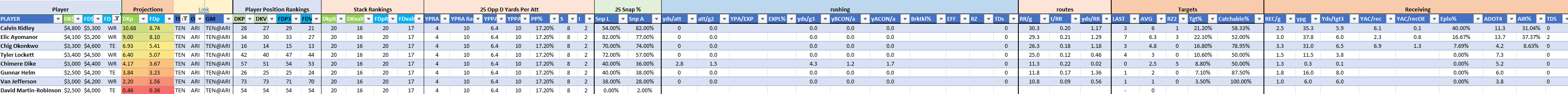 The Titans are a very low quality team that ranks as Stack 20 out of 20 by points on both sites, they climb to just Stack 17 despite cheap pricing across the board, revealing the true lack of quality. Minor shares of Ridley, Ayomanor, or Pollard are fine here and there but the full stack is not an advisable play.