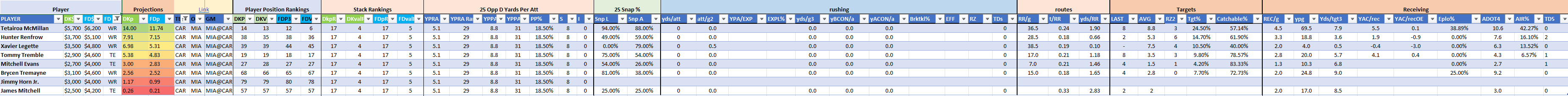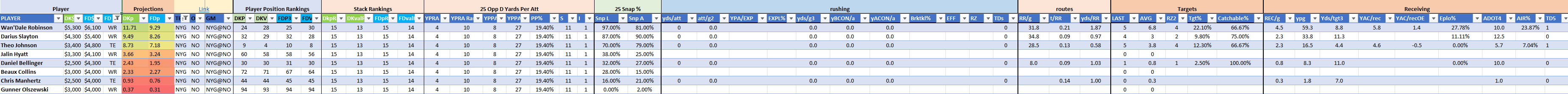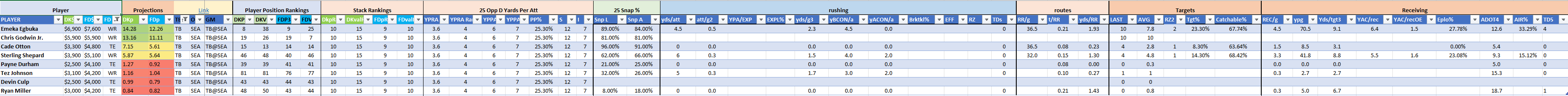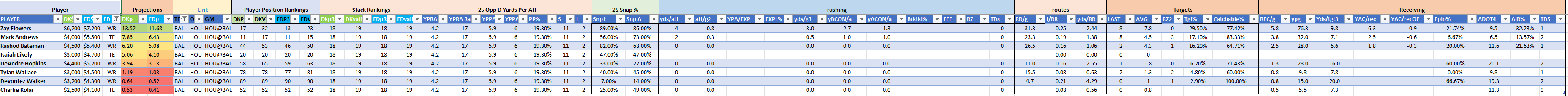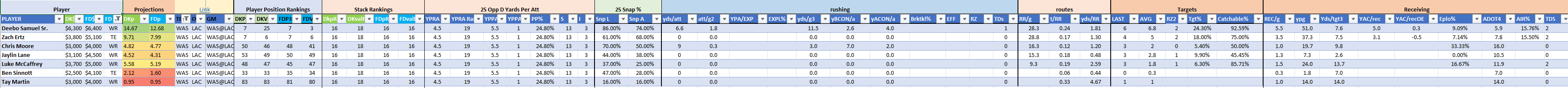We will maintain the list of rules and limits throughout the season, with occasional tweaks. Each week sees another fresh crop of value plays as situations change and injuries create opportunities around the league. These changing roles and emergent value plays are accounted for in creating these groups from week to week. After a large pool of lineups is created utilizing these groups, it is still critical to filter them for factors including ceiling projections and leverage potential. These groups should help ensure that a highly correlated premium set of options that rotates through various combinations is utilized to create the full lineup pool.