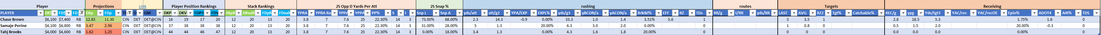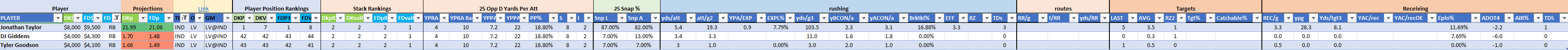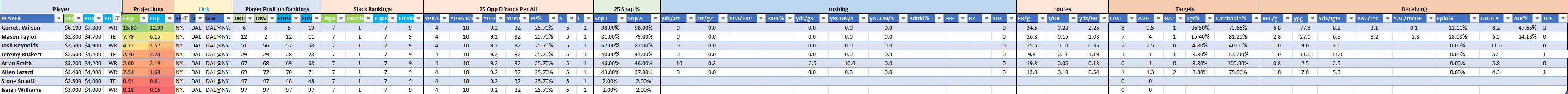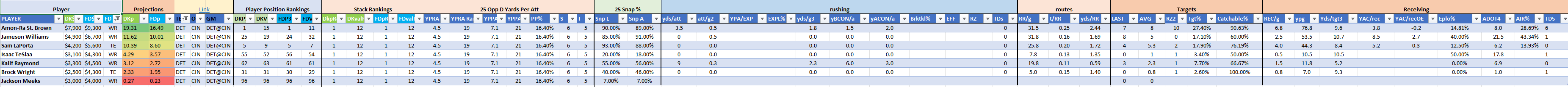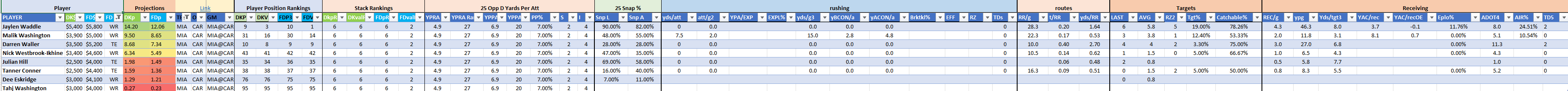 We will maintain the list of rules and limits throughout the season, with occasional tweaks. Each week sees another fresh crop of value plays as situations change and injuries create opportunities around the league. These changing roles and emergent value plays are accounted for in creating these groups from week to week. After a large pool of lineups is created utilizing these groups, it is still critical to filter them for factors including ceiling projections and leverage potential. These groups should help ensure that a highly correlated premium set of options that rotates through various combinations is utilized to create the full lineup pool.
