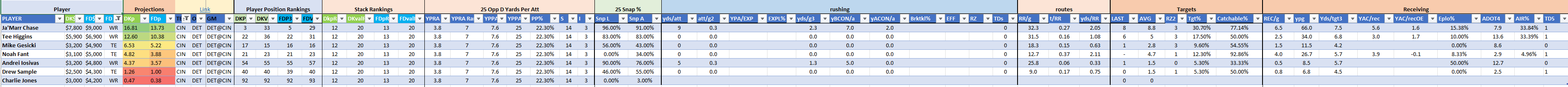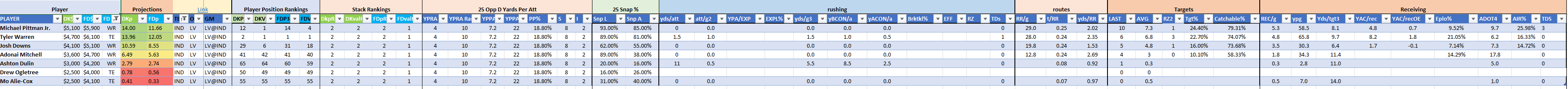The goal is to create a large pool of well-built lineups that can be utilized in any large-field GPP contest. Our approach is to build far more lineups than needed and utilize a sorting table or sim process to filter to the best set of entries. The lineups created in these crunches should provide a broad distribution that includes some of the lower-owned high-upside skill players from each stack. Applying boosts is critical in pushing and pulling ownership to individual players within their team’s stacked lineups if they appear too much or too little.