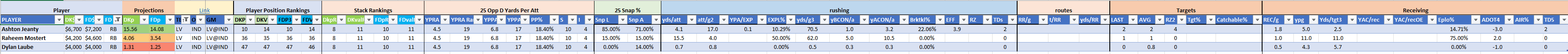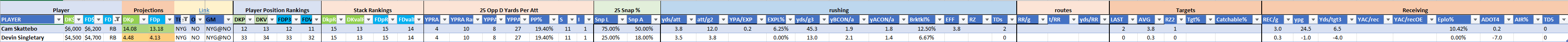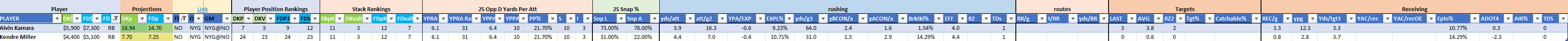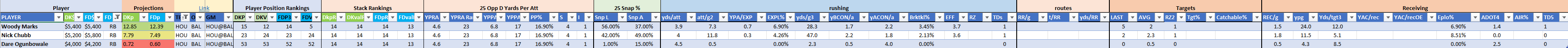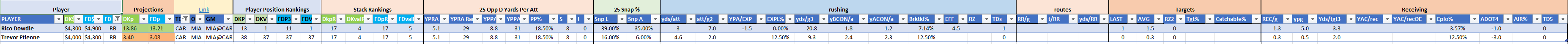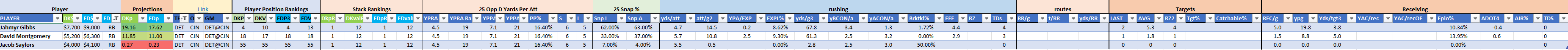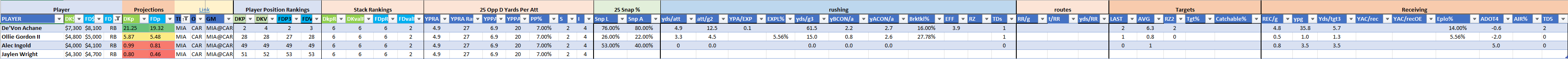 Utilizing two groups also allows us to place running backs into the “run-back” position in certain teams while not including them in the primary stack for their team. This is useful when a situation has an extremely highly projected running back that does not necessarily fit into his team’s passing game. These players are threaded throughout the following construction recommendations.