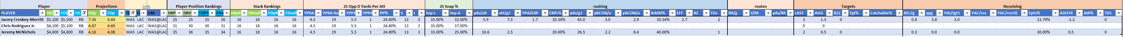 The running back position is a bit of a mess in Washington with everyone’s favorite breakout candidate “Bill” Croskey Merritt stumbling on his way to seizing the job after Austin Ekeler’s season-ending injury. The rookie fifth-rounder slots in with three straight weeks of single-digit rushing attempts after picking up 10 and gaining 82 yards in Week 1 against the Giants. Croskey-Merritt played 20 snaps with the offense in Week 4, carrying the ball just seven times but gaining 47 yards and adding 10 more on 2-2 receiving. The running back has gained an outstanding 5.9 yards per rush attempt with a 10.34% explosive rush rate and 2.9 yards after contact per attempt but as long as the team is choosing to feed Chris Rodriguez Jr. and Jeremy McNichols carries he will be limited to explosive gains for production and will be highly touchdown-dependent. Croskey-Merritt leads the job-share as RB24/25 and RB25/26 across DraftKings and FanDuel.