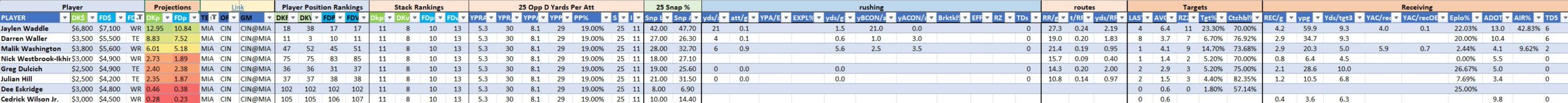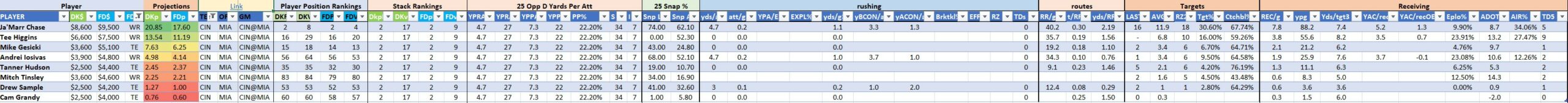 Opposing Group: Ja’Marr Chase, Tee Higgins, Chase Brown (on/off), Mike Gesicki, Samaje Perine (on/off), Andrei Iosivas, Tanner Hudson (on/off; large field), Mitch Tinsley (large field)