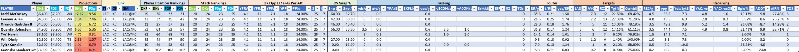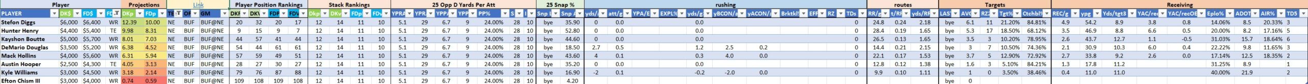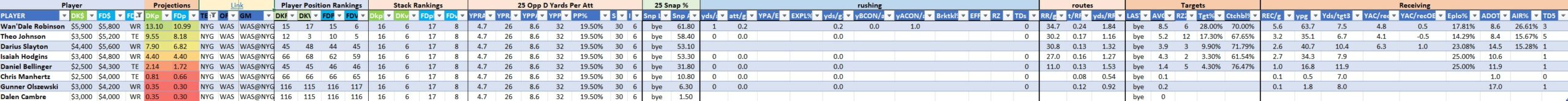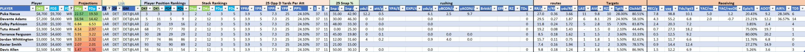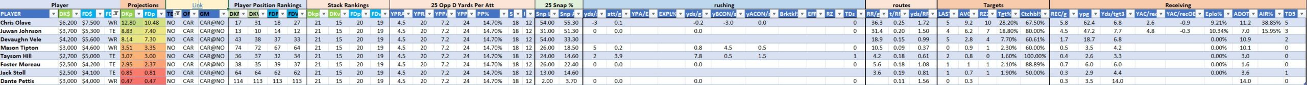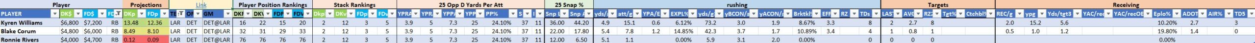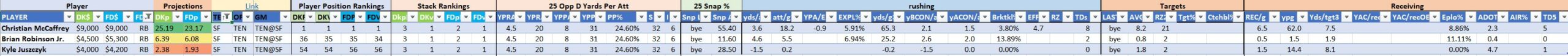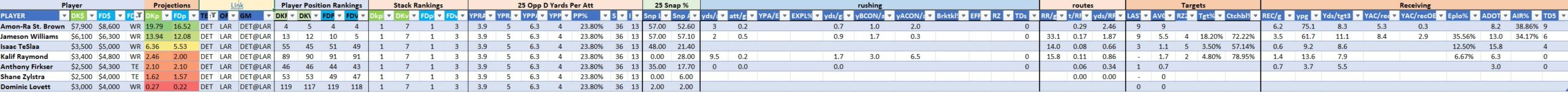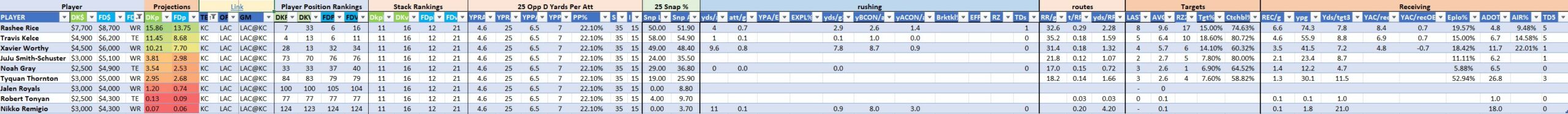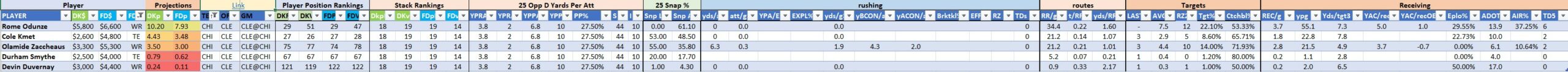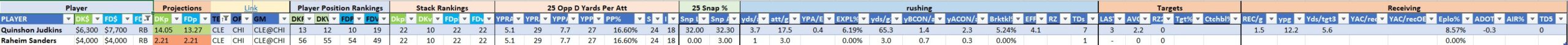 We will maintain the list of rules and limits throughout the season, with occasional tweaks. Each week sees another fresh crop of value plays as situations change and injuries create opportunities around the league. These changing roles and emergent value plays are accounted for in creating these groups from week to week. After a large pool of lineups is created utilizing these groups, it is still critical to filter them for factors including ceiling projections and leverage potential. These groups should help ensure that a highly correlated premium set of options that rotates through various combinations is utilized to create the full lineup pool.
