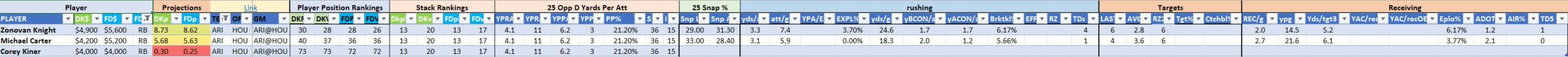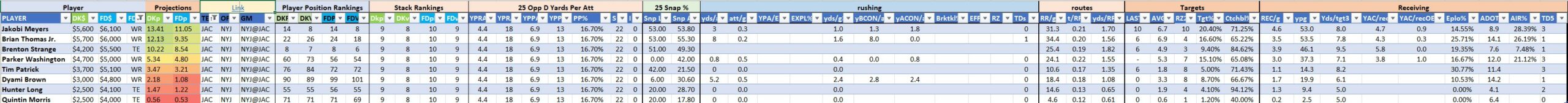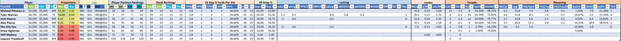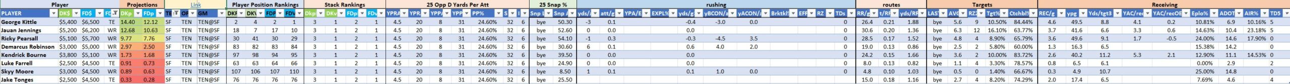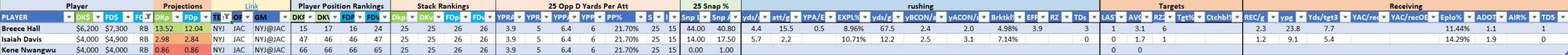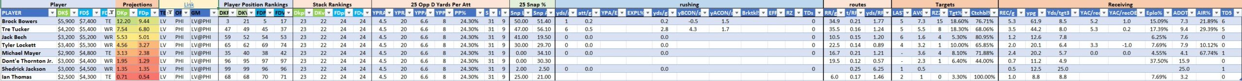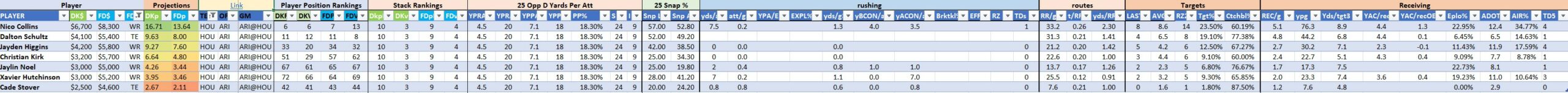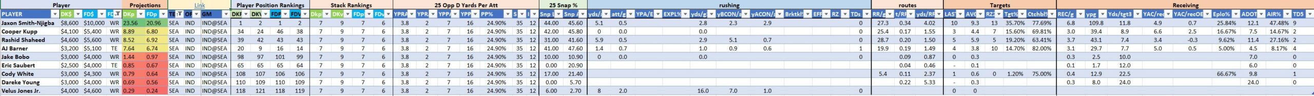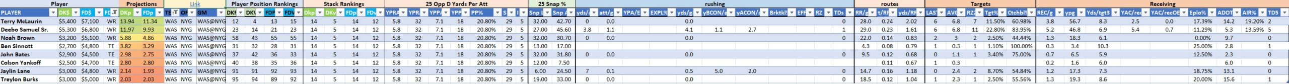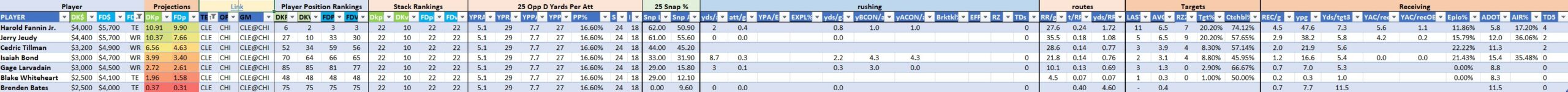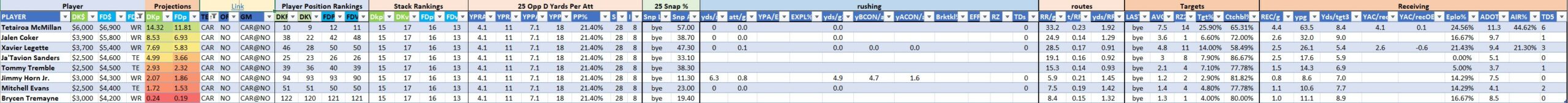 We will maintain the list of rules and limits throughout the season, with occasional tweaks. Each week sees another fresh crop of value plays as situations change and injuries create opportunities around the league. These changing roles and emergent value plays are accounted for in creating these groups from week to week. After a large pool of lineups is created utilizing these groups, it is still critical to filter them for factors including ceiling projections and leverage potential. These groups should help ensure that a highly correlated premium set of options that rotates through various combinations is utilized to create the full lineup pool.