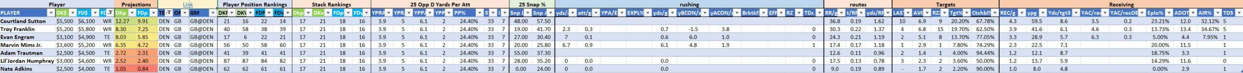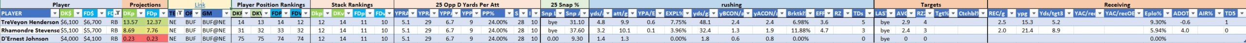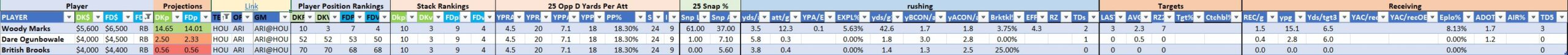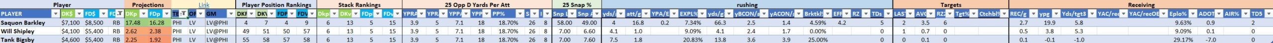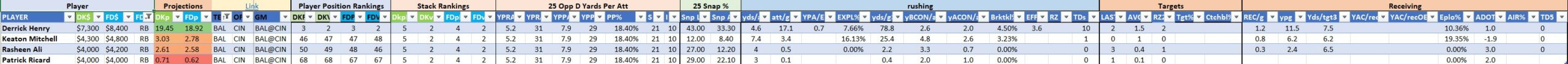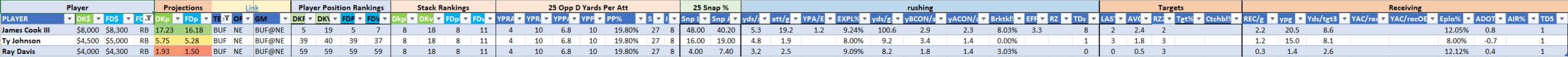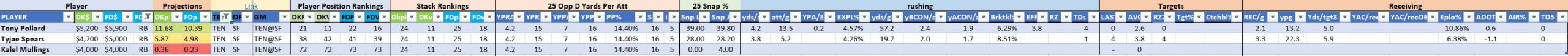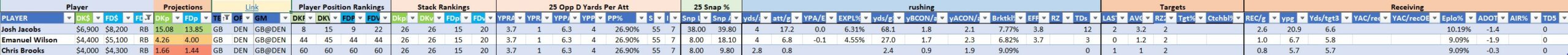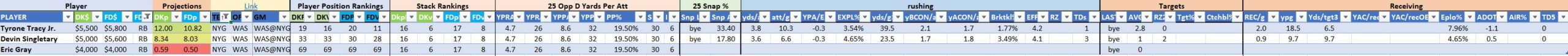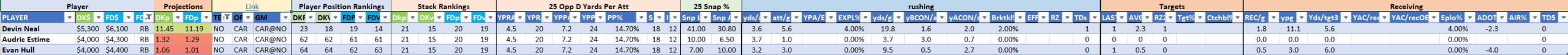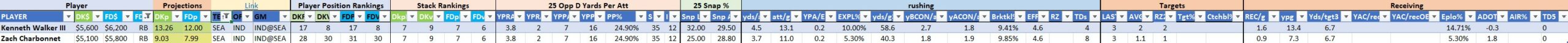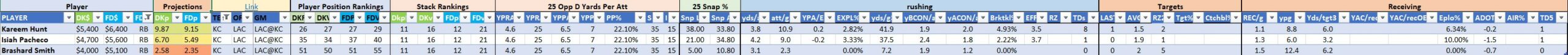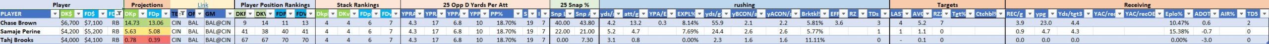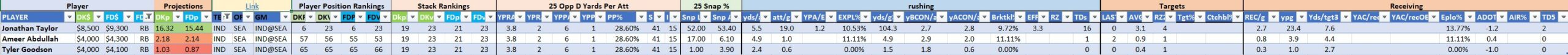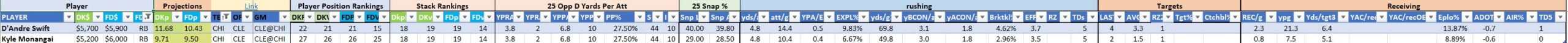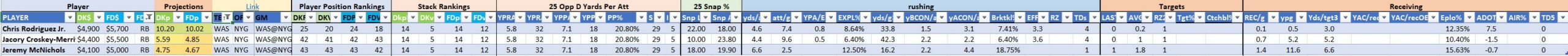 Utilizing two groups also allows us to place running backs into the “run-back” position in certain teams while not including them in the primary stack for their team. This is useful when a situation has an extremely highly projected running back that does not necessarily fit into his team’s passing game. These players are threaded throughout the following construction recommendations.