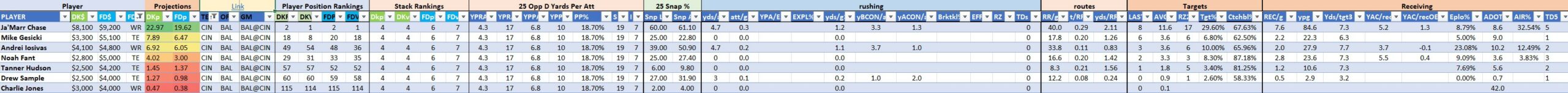 Opposing Group: Ja’Marr Chase, Chase Brown, Mike Gesicki, Andrei Iosivas, Mitch Tinsley, Samaje Perine (on/off), Noah Fant (on/off; large field)