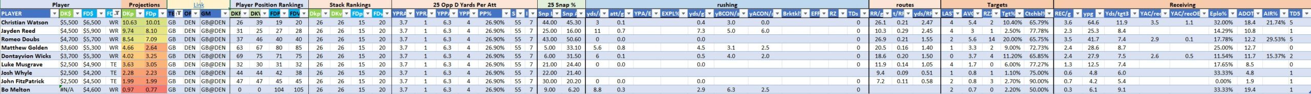 - optional – QB with at least one RB/WR/TE from the Opposing Team (we typically prefer the pass-catchers but high-volume running backs can be effective here)