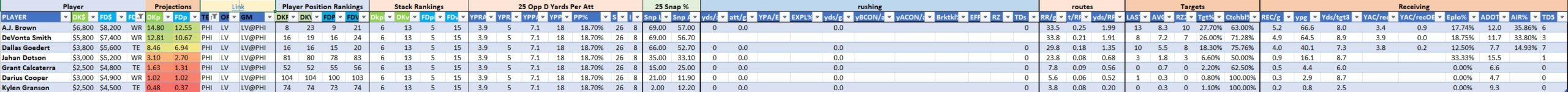 The goal is to create a large pool of well-built lineups that can be utilized in any large-field GPP contest. Our approach is to build far more lineups than needed and utilize a sorting table or sim process to filter to the best set of entries. The lineups created in these crunches should provide a broad distribution that includes some of the lower-owned high-upside skill players from each stack. Applying boosts is critical in pushing and pulling ownership to individual players within their team’s stacked lineups if they appear too much or too little.